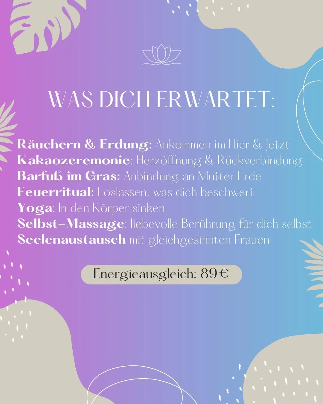 Es erwarten dich 3 Stunden volleR Frauen-power und Magie mit einer Kakao- und einer Feuerzeremonie, einer erdenden Yogaeinheit, Meditation & Achtsamkeit, einer Selbstmassage von Händen und/ oder Füssen als Geschenk von dir für dich und einfach wundervoller Austausch unter Frauen, barfuss laufen im schönen garten und ganz viel Magie, die entsteht, wenn Frauen ganz bewusst zusammenkommen und sich im kreis verbinden.